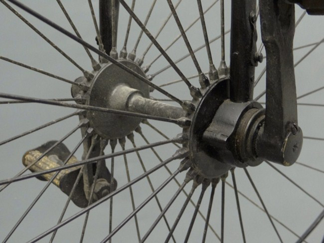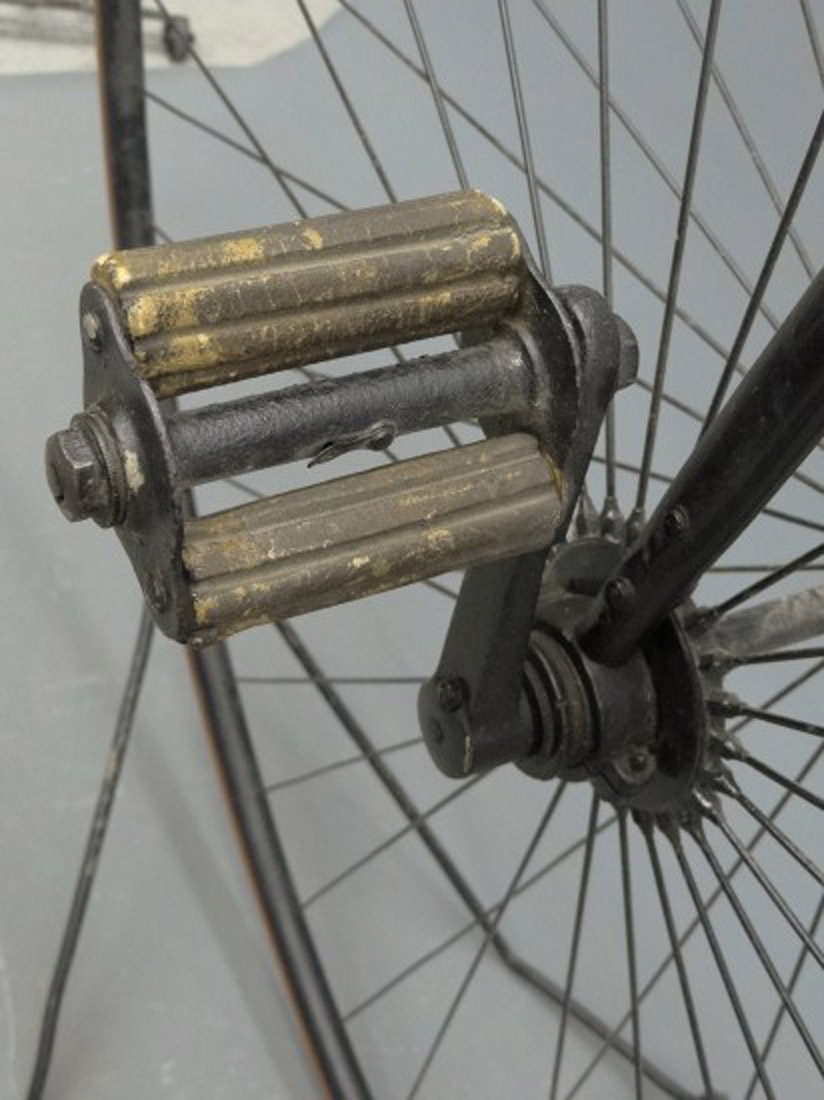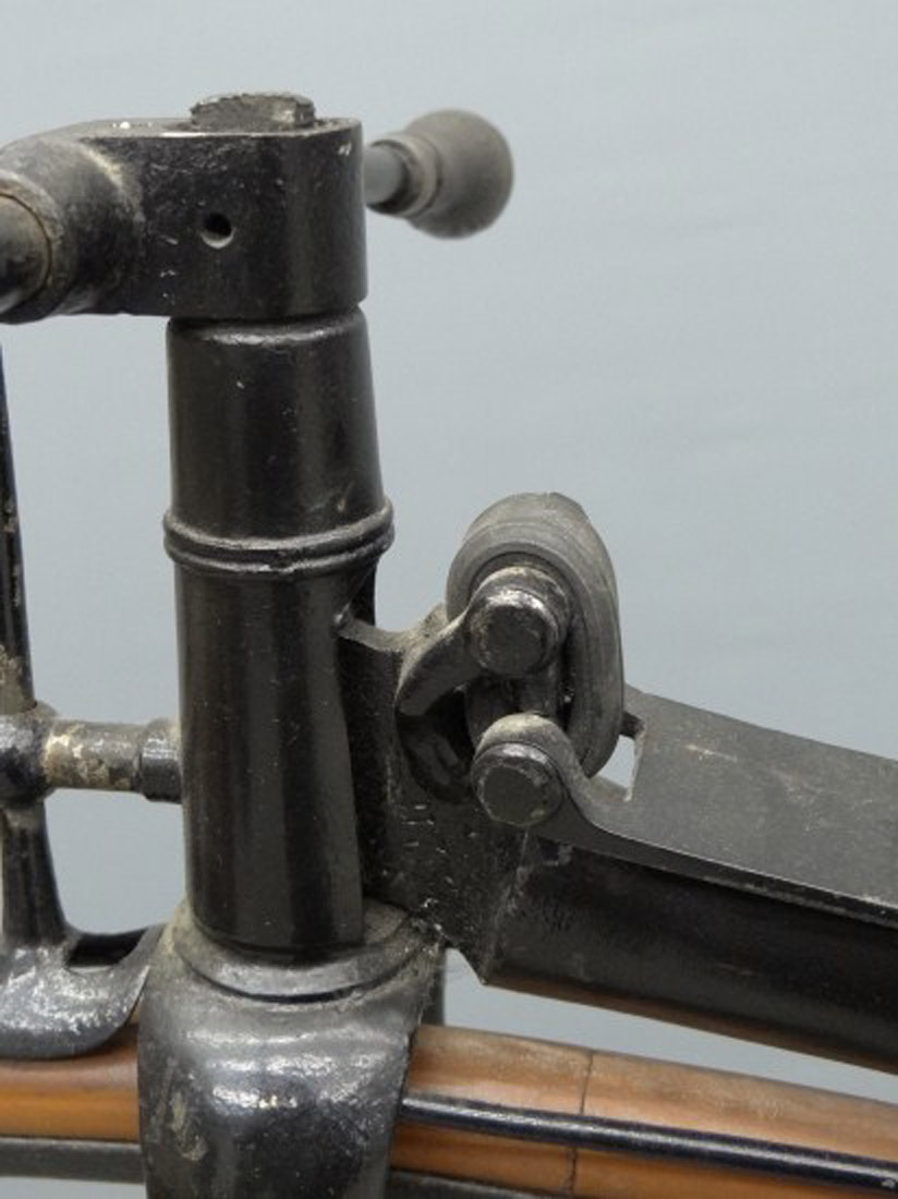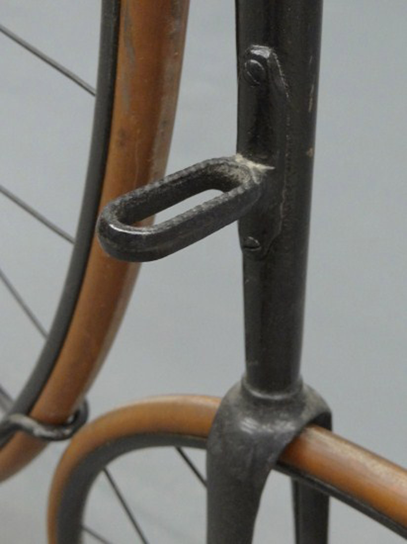 Older ordinaries (pre-1880) had a braking system where twisting the handlebars would apply the rear wheel brake. Here we see this system with a front wheel brake. This roller brake was used for a short period in 1879-1880 on the Club models. After that period they had the more usual spoon brakes.