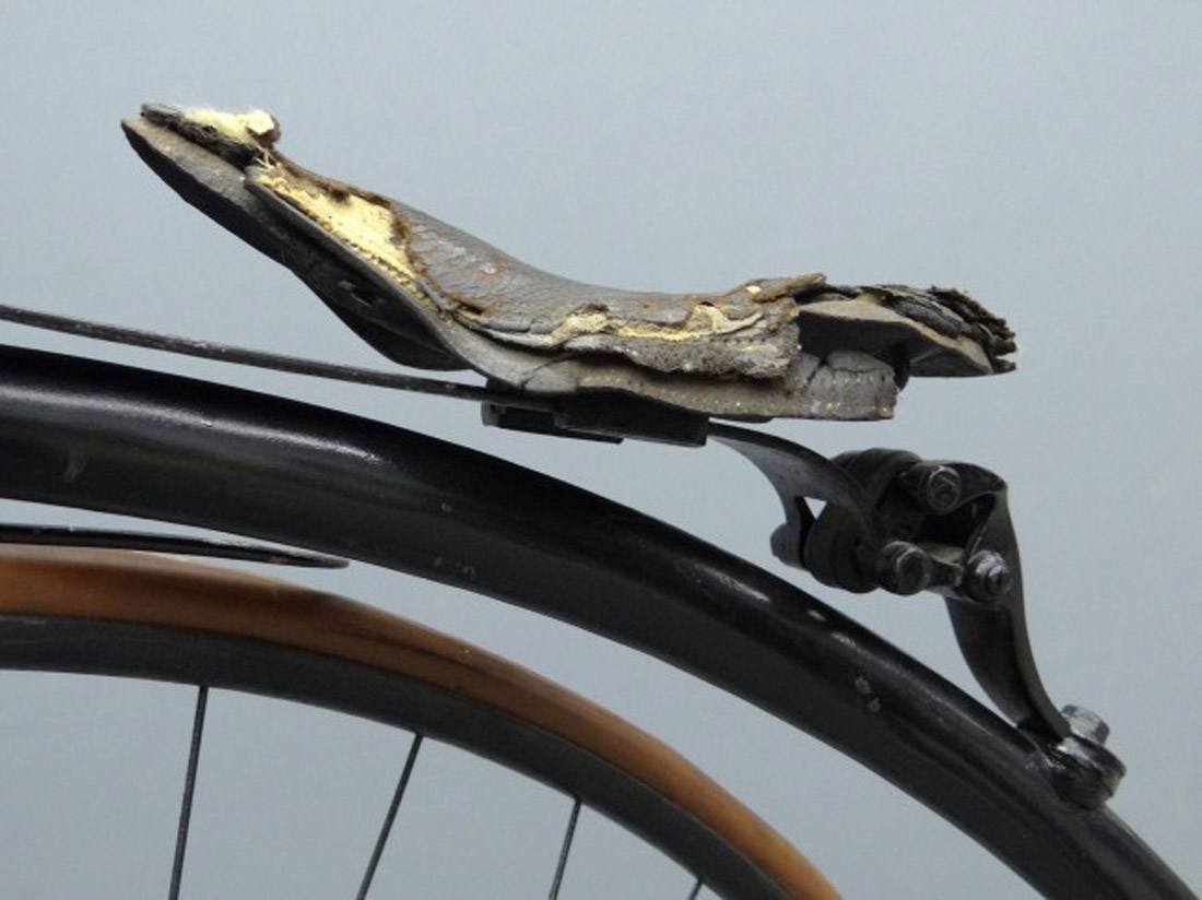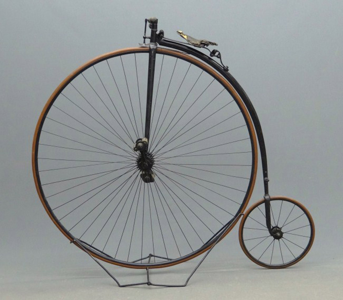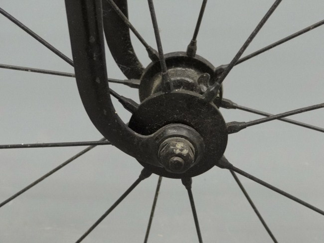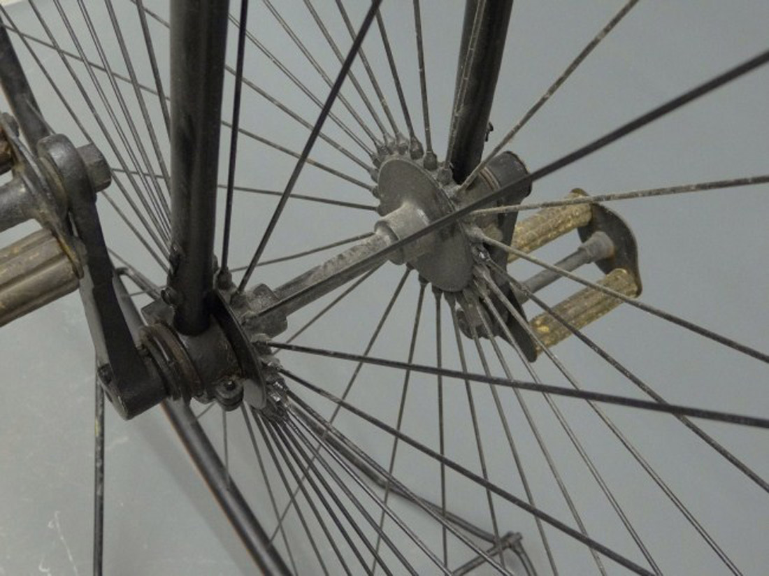 Older ordinaries (pre-1880) had a braking system where twisting the handlebars would apply the rear wheel brake. Here we see this system with a front wheel brake. This roller brake was used for a short period in 1879-1880 on the Club models. After that period they had the more usual spoon brakes.